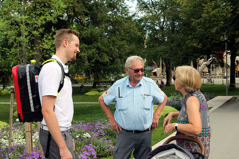 Bei einem Kontrollgang mit Herbert und DRKler Joshua Krall gibt es keinen Vorfall. Der junge Mann misst knapp zwei Meter und ist seit sechs Jahren beim DRK - und hat bereits viele Dienste während der Gartenschau geleistet. Das sind Aufgaben, bei denen man einfach mitmachen muss, sagt er. Auch so ein straffes Programm wie die Gartenschau müsse das DRK vor Ort meistern. Jeder müsse seinen Beitrag leisten, "das liegt in der Verantwortung von uns allen!" Zwischen den Einsätzen könne man es sich als Helfer auch mal gutgehen lassen. Wenn dann wieder etwas passiert, sind sie da. Angst vor schwierigen Einsätzen hat er nicht. Er hat eine gute Ausbildung genossen, und im wenn sie mal überfordert sein sollten, stehen die Profis vom Rettungsdienst bereit und könnten übernehmen. Und so endet der Rundgang ohne Zwischenfall. Herbert und Krall kehren in die Zentrale zurück. Wenn etwas passiert, stehen sie bereit.