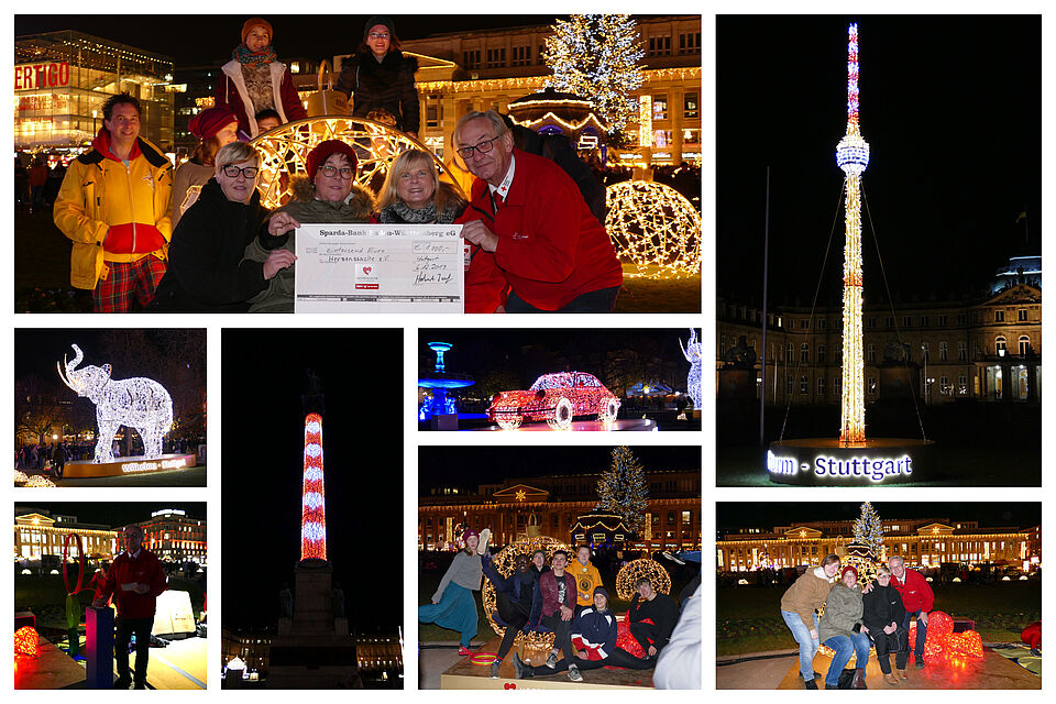 Die Verantwortlichen von Herzenssache haben die Spender aus Schorndorf auf den Stuttgarter Weihnachtsmarkt eingeladen, um den Scheck entgegenzunehmen. Birgit Kralisch, Anke Sibler, Sepp Herbert und Philip Falliano legten vor Ort dann noch eine Spende drauf, denn bei der Aktion "Glanzlichter" konnte man die Jubiläumssäule auf dem Stuttgarter Schlossplatz zum Leuchten bringen: Sepp Herbert drückte den Buzzer und die Säule nahm kurz ein wunderschönes DRK-Rot an. Neben der Kleiderstube hat auch die Bereitschaft aus Schorndorf zur stolzen runden Summe beigetragen. Sie steuerten 300 Euro bei. Diese Summe kam zusammen, weil die Rotkreuzler als Dankeschön für ihren großartigen Einsatz während der Gartenschau mitunter Spenden erhalten hatten, die sie nun ebenfalls für den guten Zweck eingesetzt haben.